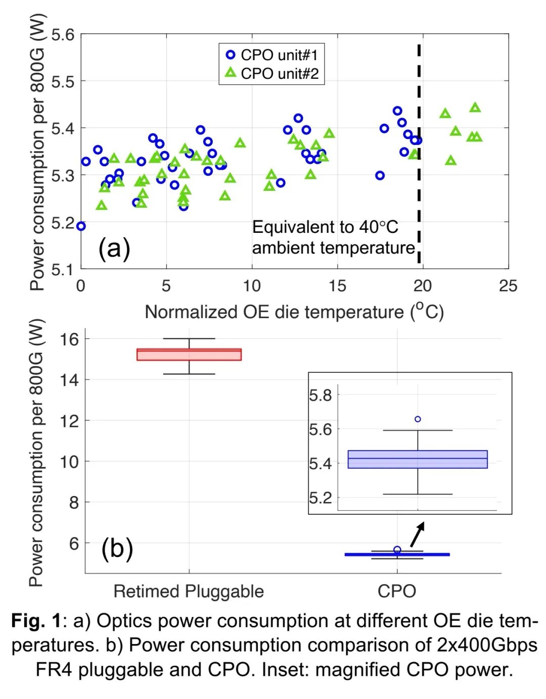 结果显示,CPO技术相比传统可插拔方案功耗降低65%(5.4W vs 15W),全配置系统可节省超500W。即便在40℃的应力温度条件下,OE芯片温度升高对功耗的影响可忽略不计,验证了CPO在高温环境下的功耗稳定性。