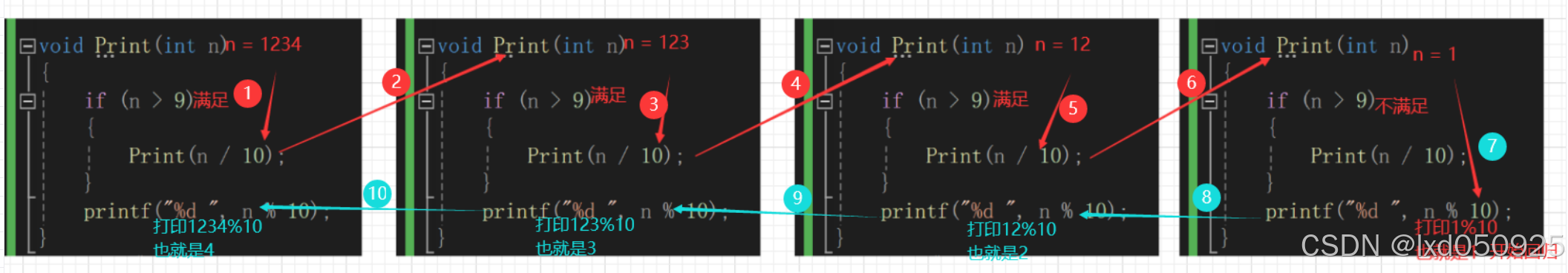 通过分析,我们可以想到用取模和取余的方法,1234%10就能得到4,然后1234/10得到123,这就相当于去掉了4 然后继续对123%10,就得到了3,再除10去掉3,以此类推不断的 %10 和 /10 操作,直到1234的每⼀位都得到,但是这⾥有个问题就是得到的数字顺序是倒着的,经过脱离,我们可以得到如下代码。