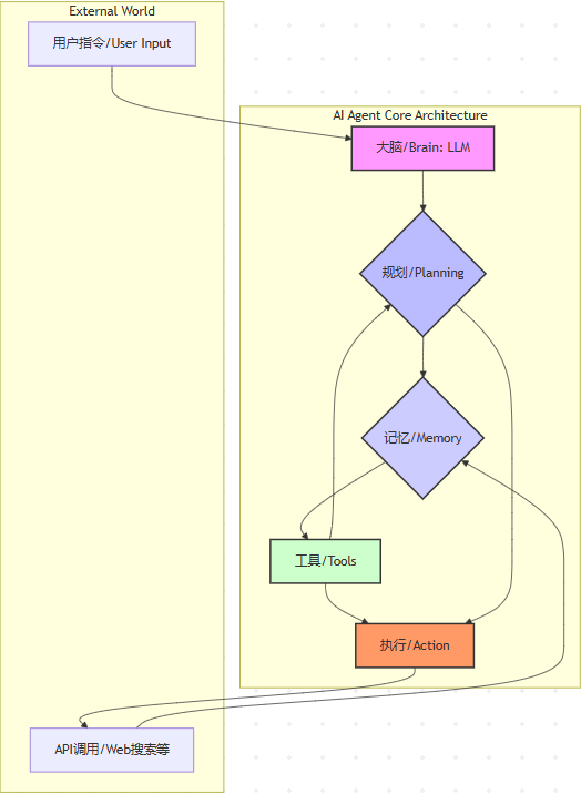 一个现代的AI智能体,其核心通常由以下几个关键模块构成。我们可以通过下面这张架构图来直观理解。