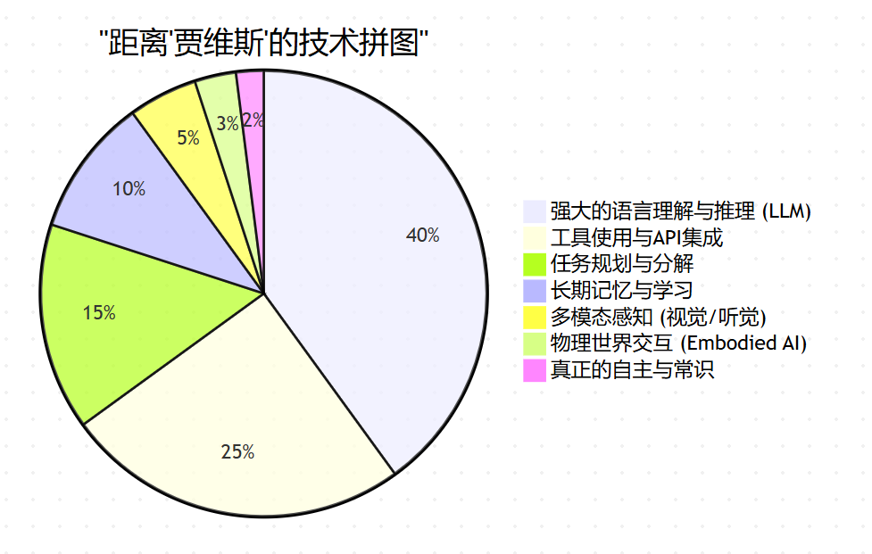如图所示,我们已经在语言能力和工具使用上取得了长足进步,这也是当前AI Agent热潮的基础。但在长期记忆、多模态感知(“贾维斯”能看能听)、物理世界交互(控制机器人)以及最核心的真正自主性与常识方面,我们才刚刚起步。