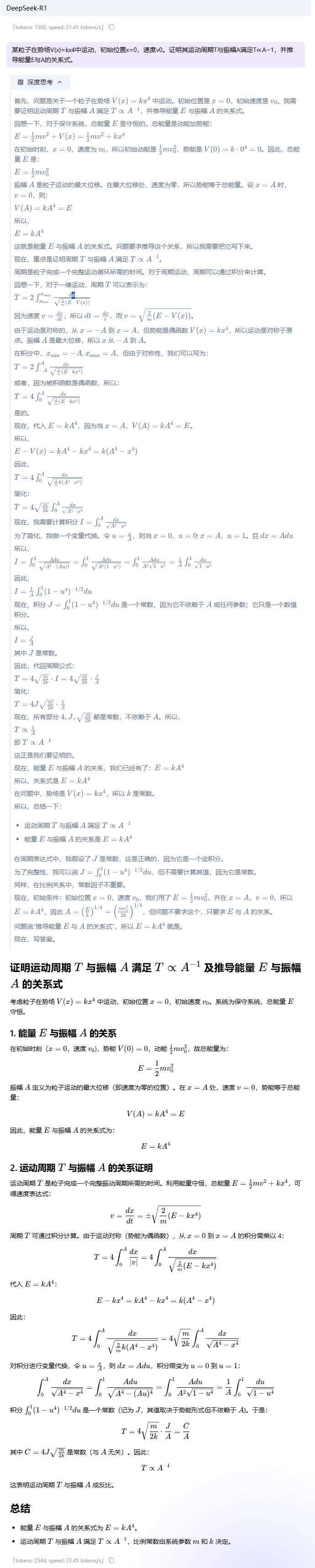 某粒子在势场V(x)=kx4中运动,初始位置x=0,速度v0。证明其运动周期T与振幅A满足T∝A−1,并推导能量E与A的关系式。