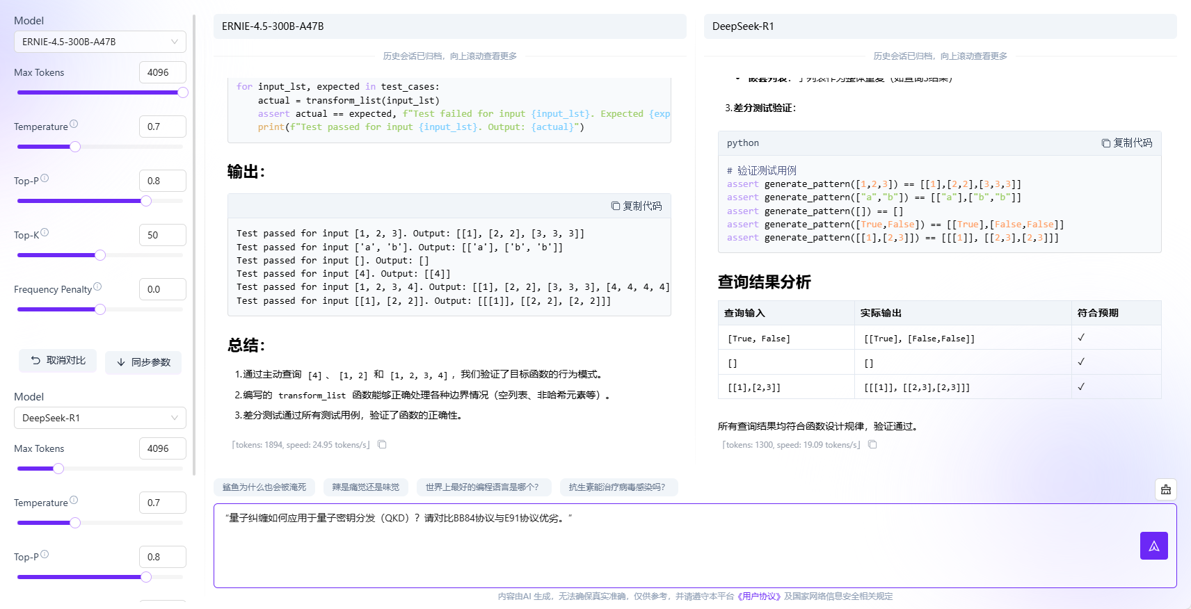 通过这个经典问题的对比,我们可以看到ERNIE-4.5-VL-424B-A47B能准确归纳出“第i个元素重复i+1次”规律,主动查询设计合理,无明显逻辑矛盾,边界情况(空列表、非哈希元素)有处理,代码实现详细,注释充分,差分测试覆盖多种情况。逻辑推理能力和代码实现比较优秀,甚至比之前大火的deepSeek R1模型对于该推理题的回答还要优秀不少。
