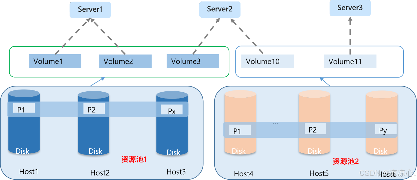 很多服务器,每块服务器中也只有3、4块硬盘, 我们通过某些技术手段将每个服务器上的硬盘,合并成一个逻辑上的资源池。 这时存一部电影,可能会将电影的资源数据分开存储在不同服务器的不同的硬盘中。 将数据分开存储,但这些存储又都是在一个逻辑上的资源池中