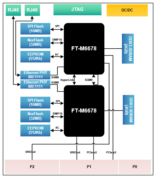 ● 板卡采用两片DSP FT-M6678芯片,8核,单核主频1G。