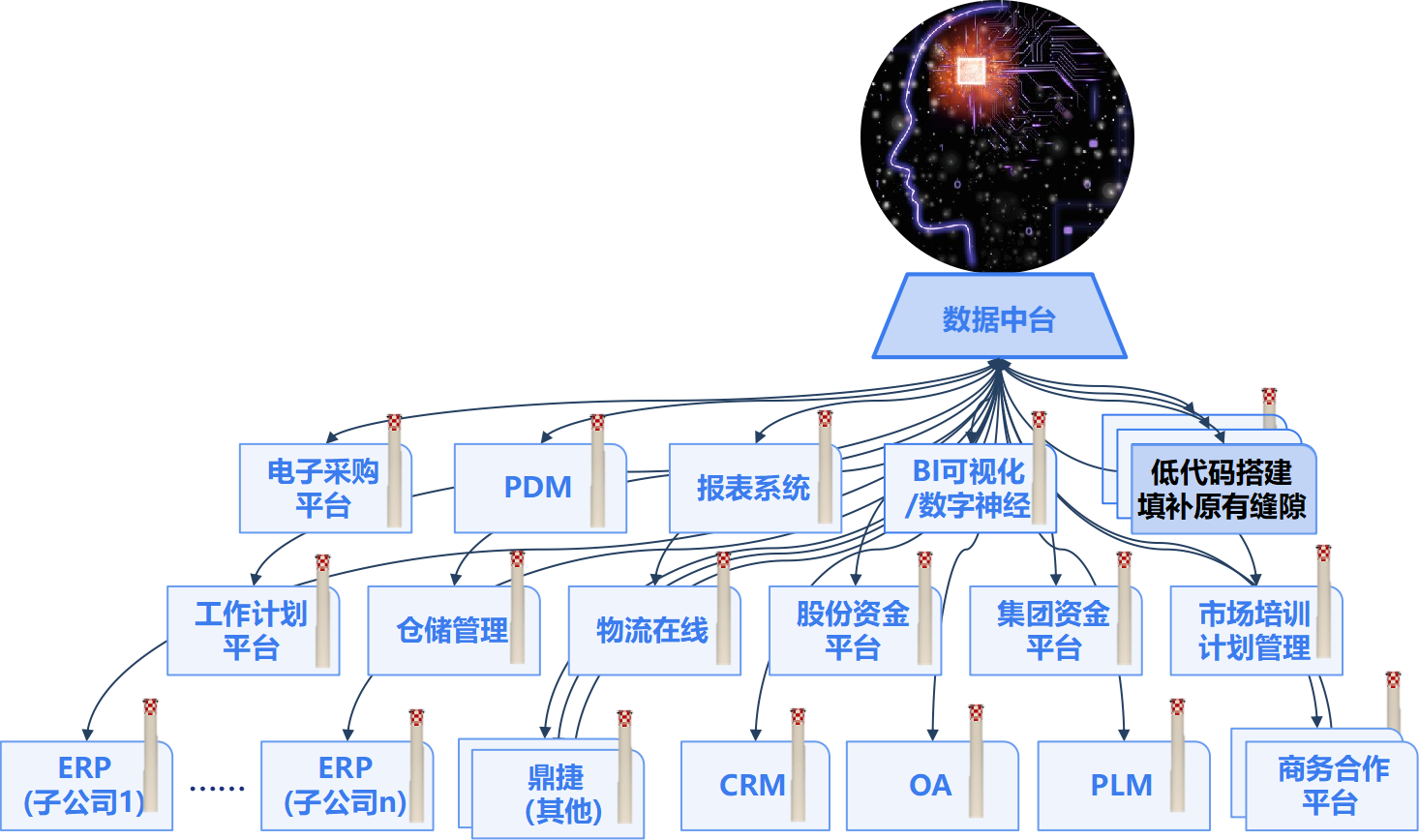传统信息化系统如同分散的神经元,数据中台则扮演着“中枢大脑”的角色,通过建立统一的数据标准、元数据管理和数据服务目录,将分散在多个业务系统的数据资产集中在一起,进行治理重构,最终形成一体化。