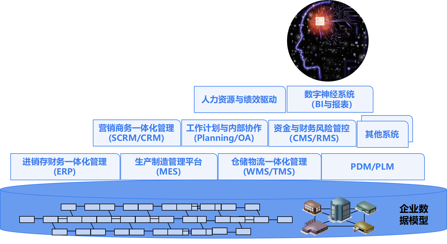 通过构建数据中台实现企业的数字化转型,往往成为信息化建设比较成熟的企业的数字化策略,但企业中各信息系统自身的底座毕竟不是统一规划的,数据通信与协作效率低,同步时间往往滞后。而对于信息化刚起步或者立志重构管理系统的企业来讲,他们更愿意统一规划企业数据模型,新建或重构更全面、链条更完整的应用系统,并通过绩效管理与数字神经系统来打造数据驱动的智慧运营管理模式,成为他们实现数字化转型的策略。