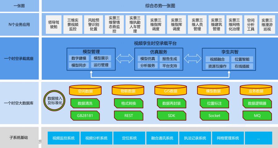 智汇云舟视频孪生智能体建设方案设计采用“1+1+1+N”的总体架构,打造包含“一库、一底座、一张图、N应用”的视频孪生智慧城市一张图,赋能城市场景全空间要素时空一体感知、分析、预测、管控,辅助管理者开展科学决策与应急处置。