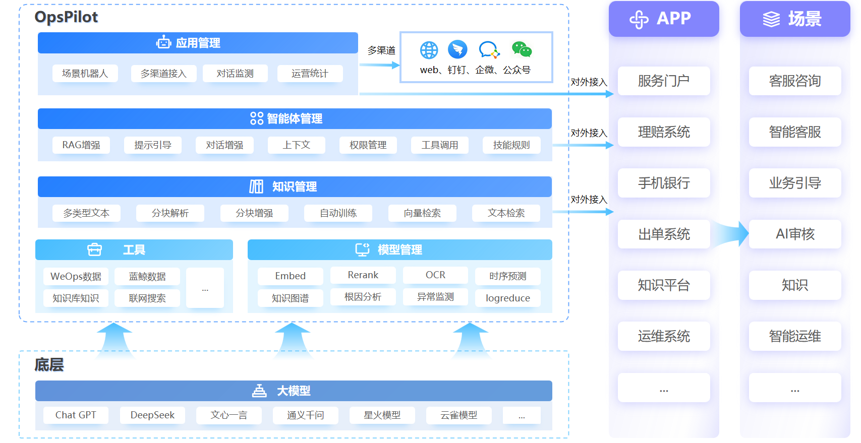嘉为蓝鲸智能运维OpsPilot是集知识库管理、技能配置、机器人管理及工具管理于一体的智能运维支撑平台,深度融合LLM大模型的语义理解、知识增强与多模态处理能力,聚焦运维领域,突破单一LLM能力局限,成为更懂运维的智能AI平台。