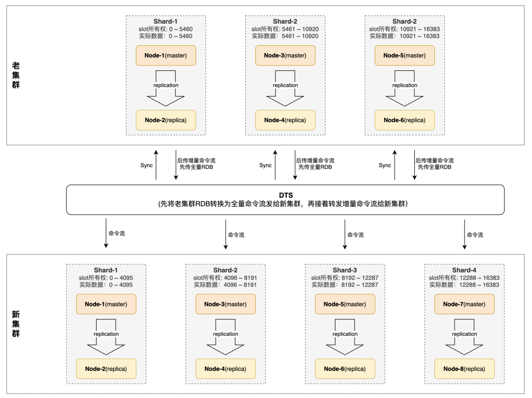 因为有着旁路组件在中间做“翻译官”,发给新集群的都是命令流,新集群的分片数就和老集群完全解耦了,只要数据能放得下,比老集群分片数多点少点都OK。以一个3分片集群扩为4分片集群为例,数据同步的示意如图5所示: