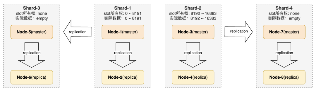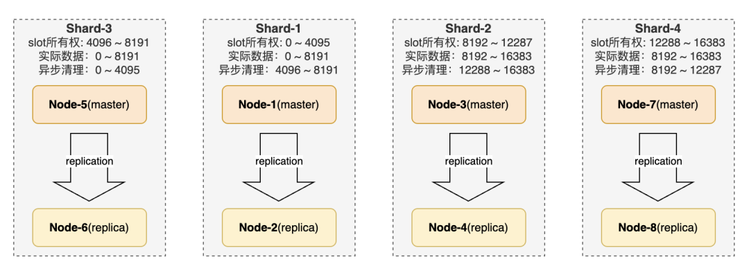 上一步完成后,对于每一组的新老分片而言,它们各自获得老分片原先一半 slot 的归属权,但是新老分片都还有老分片原先的所有数据。换言之,新老分片都有一半的数据其实已经没用了,但还占用着内存空间。此时新老分片需要各自发起一个异步的后台清理任务,将已经不属于自己负责的 slot 数据清理掉,如图6-3所示。等清理任务结束,本次扩容任务就完成了。