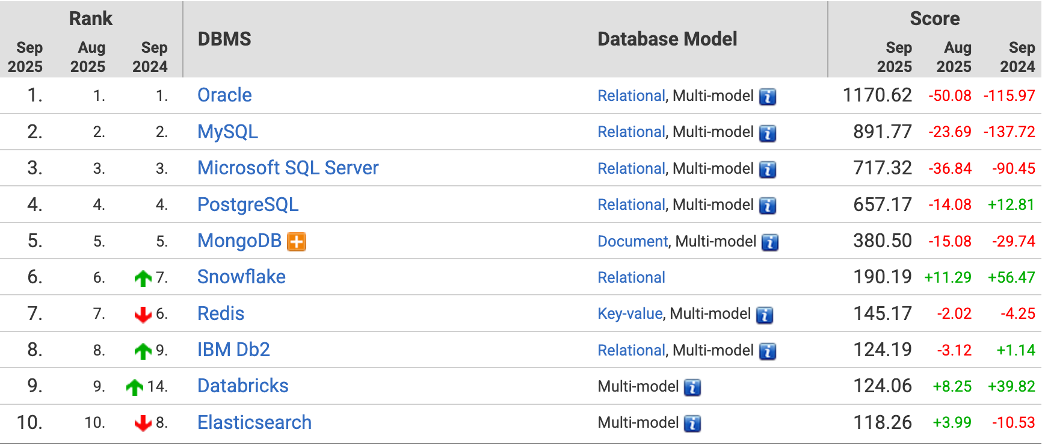 ▲图1.DB-Engines 数据库流行度排行榜(2025.09)