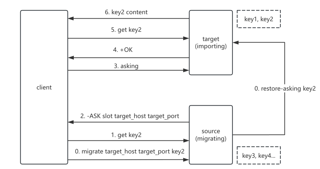 因为迁移过程的非原子性,所以在迁移的过程中会有一个时间段, slot 中的一部分 key 已经搬迁到了目标节点,而另一部分 key 还在源节点等待搬迁。而社区提供的是一个在线的热迁移方案,过程中无需业务停服。所以,就面临一个问题,如果迁移中有客户端要访问这个 slot 中的 key ,它也不知道这个 key 是在源节点还是目标节点,那要怎么办呢?社区方案给出的方法是 ASK 重定向,大致的原理如图3所示,说明如下:
