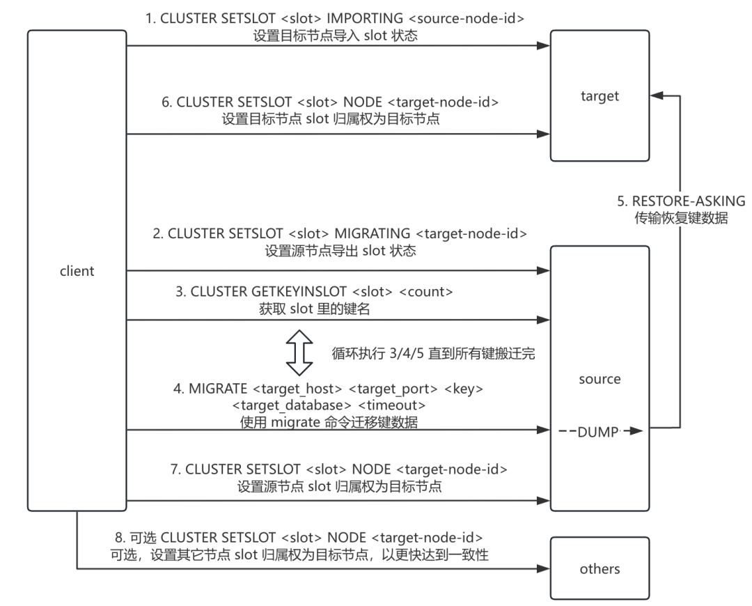其中,1/2是状态标记阶段,主要是在目标节点和源节点分别标记 slot 的 IMPORTING (导入)和 MIGRATING (导出)状态;3/4/5是数据搬迁阶段,循环通过 MIGRATE 命令搬迁一批 key ,直至完成所有 key 的搬迁,这也是耗时最长的一个阶段;6/7/8则是归属转移阶段,负责清理 slot 的 IMPORTING 和 MIGRATING 状态,并将 slot 的归属权更新为目标节点。可以看到,在流程的标记和转移阶段,处理的粒度是整个 slot ;但在数据搬迁阶段,处理的粒度则是 slot 中的 key 。