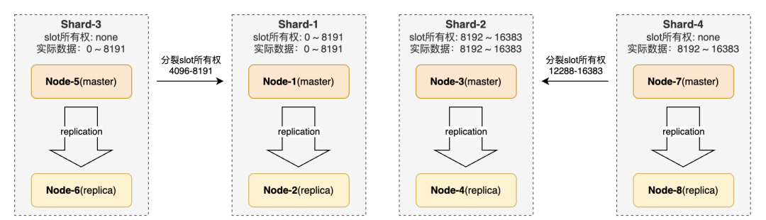 节点复制完成后,两组对应的新老分片之间数据基本是一模一样的(只是增量写入部分新分片有一些滞后),只是新分片还不负责任何 slot 。此时,每个新分片依次向对应的老分片发起分裂一半 slot 归属权的请求,如图6-2所示。归属权分裂的底层实现方式有很多种,比较优雅的一种是借鉴 Redis 自身的 manual failover 实现机制,区别只是说,分裂只获取对应老分片一部分 slot 的归属权,分裂后老分片的主节点角色还是 master 。
