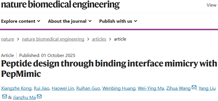 Kong, X., Jiao, R., Lin, H. et al. Peptide design through binding interface mimicry with PepMimic. Nat. Biomed. Eng (2025).