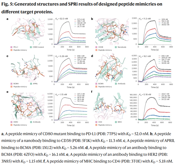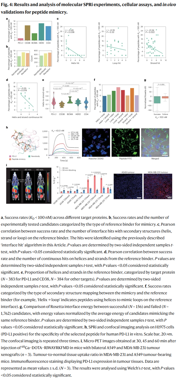 在 SPRi 实验中,研究人员测试了五个靶点(PD-L1、CD38、BCMA、HER2、CD4)的 384 条候选肽。结果显示 CD38、HER2 和 CD4 的命中率超过 10%,而 PD-L1 和 BCMA 较低。进一步分析发现,当参考界面以环状结构为主时更容易成功,而以螺旋或 β-链为主的界面则更难稳定模拟(图4)。其中一条针对 PD-L1 的肽(RIWAYRKFMD)在细胞和小鼠模型中表现出高亲和力和特异性。