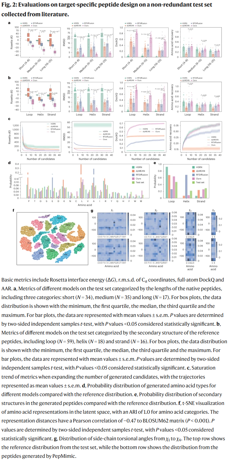 研究人员在包含 93 个非冗余蛋白复合物的测试集上评估了 PepMimic,采用界面能量、均方偏差、DockQ 和氨基酸恢复率等指标。与 dyMEAN、HSRN 和 RFDiffusion 等最新模型比较,PepMimic 在所有指标上均表现更优,且在不同长度肽分子中保持稳定优势(图2a-c)。此外,PepMimic 生成的氨基酸分布与测试集更为接近,潜在空间的氨基酸表示显示了明确的聚类,能够反映理化性质和功能的相似性(图2d-g)。