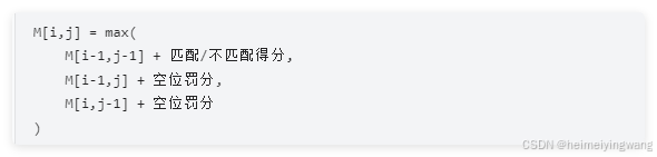 从左上角到右下角填充一个二维矩阵,每个单元格的值表示对应子序列的最优比对得分。计算公式为: