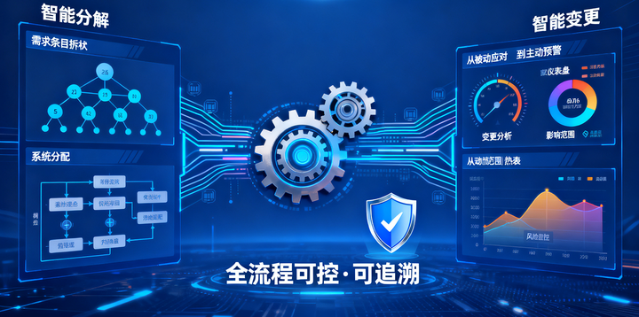 需求全流程中,变更管理与条目化拆解是关键难点。Visual RM 通过 “智能分解与条目化”“智能变更 & 分析” 模块,以 AI 实现需求的精细化管控与变更风险预警,确保需求从分析到落地全过程可控、可追溯。