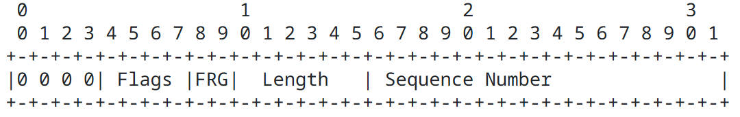 • 2比特的FRG位,用来标识是否分片。第一个比特是B位也就是开始位,第二个比特是E位也就是结束位。对于未分片的数据包的B位和E位都是0。