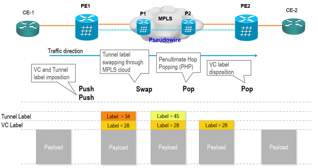 4. P2通过次末跳弹出机制将最上层的标签弹出,将带VC标签的数据包发给PE2。