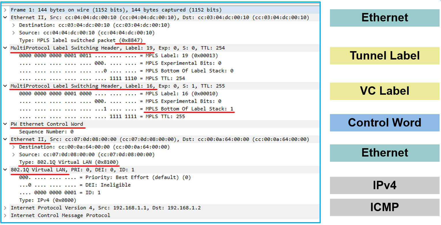 入口PE在收到客户的以太帧的时候,会将最前面的前导码和最后的校验码移除。在客户以太帧头部前面封装隧道标签,VC标签和控制字。最后再封装进以太帧,以太的类型为MPLS,表示后面接的MPLS的标签而不是IP包。抓包的文件显示如下: