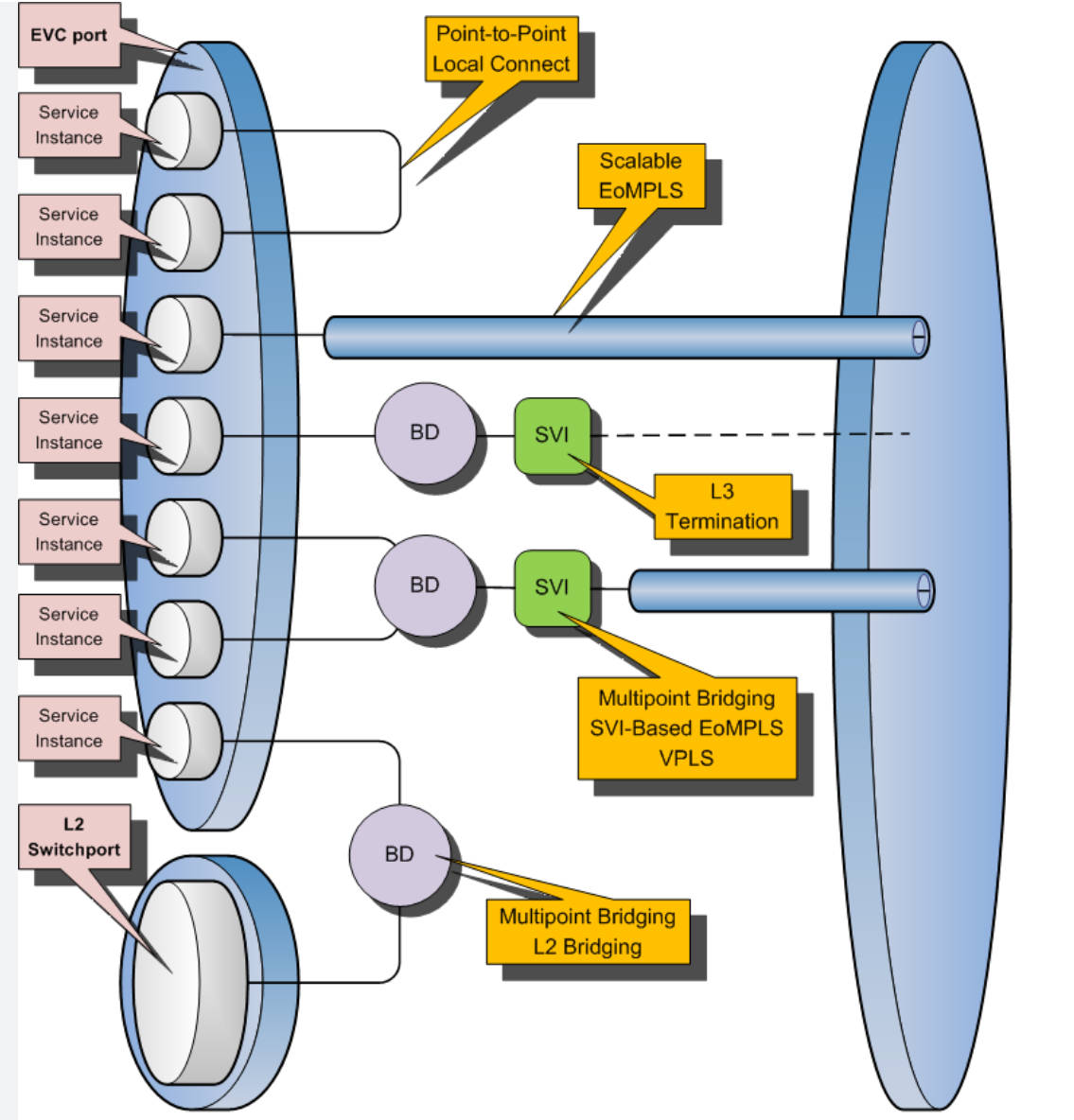 • 一个EFP Service Instance是连接BD和物理接口的虚拟接口。