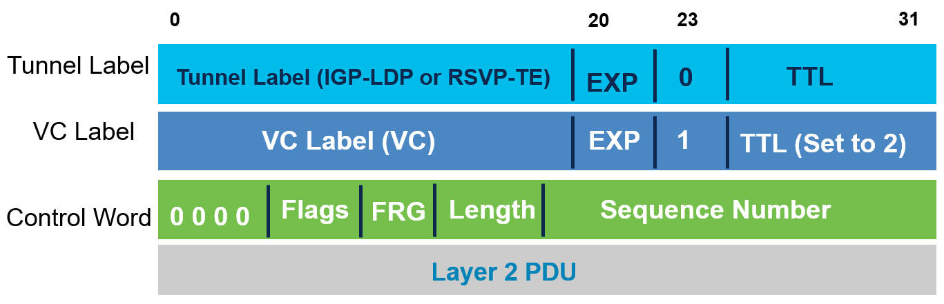 • 控制字:当PSN网络为MPLS时使用。为可选项,但是有些原生的2层协议则为要求必须有控制字。对于以太网,则为可选项。