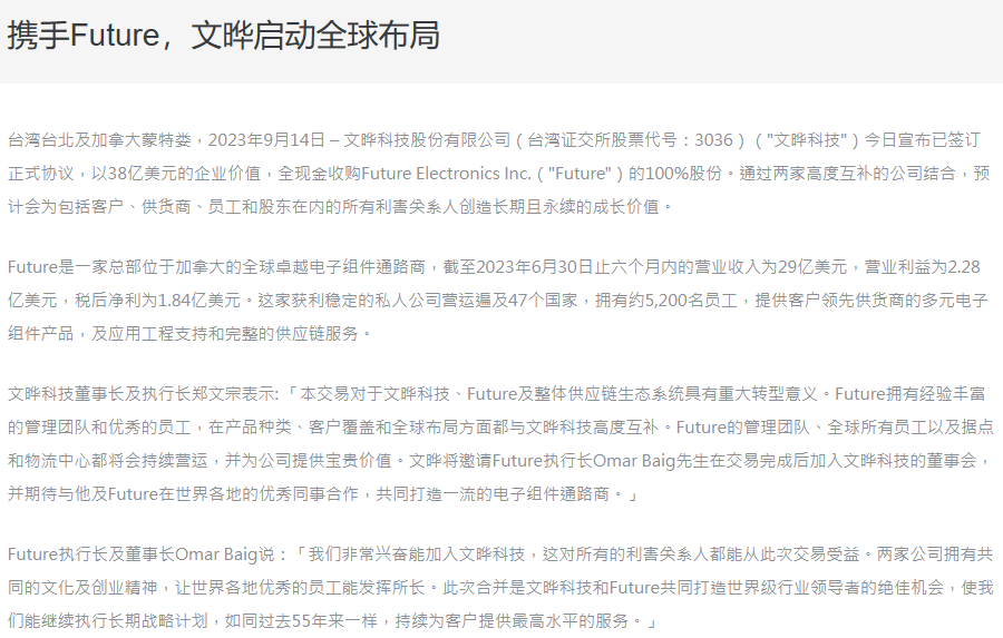 文晔科技以38亿美元的全现金收购Future Electronics Inc.("Future")的100%股份。
