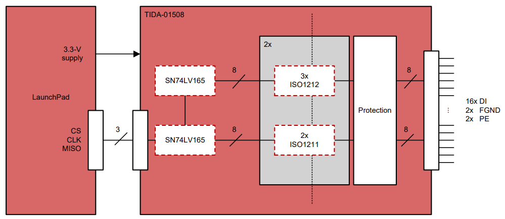 使用 TI 的 ISO121x 器件实现的 16 个隔离式数字输入通道。该设计无需隔离电源即可工作,每通道支持高达 100kHz 的输入信号 (200kbit)。所有 16 个通道的输入功率总和不到 1W,从而实现了紧凑的布局,并将散热降至最低。