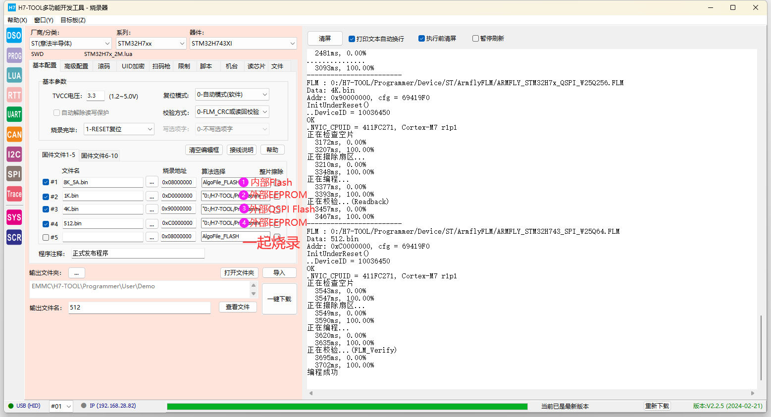 这样我们就可以内部Flash,外部SPI Flash,外部QSPI Flash,外部EEPROM一起烧录, 支持1拖4,1拖16: