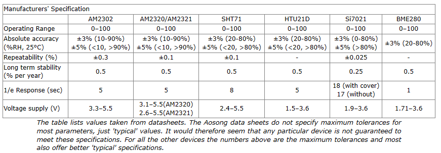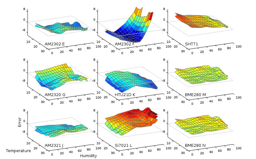 8、8款温湿度传感器DHT22、AM2302、AM2320、AM2321、SHT71、HTU21D、Si7021和BME280性能测评