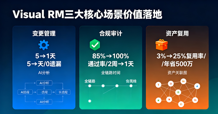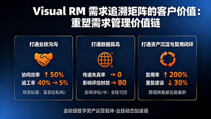Visual RM 需求追溯矩阵数十家金融机构成功落地应用(文档 1 “典型客户”),其价值在 “变更管理、合规审计、资产复用” 三大核心场景中尤为突出,成为企业降本、提效、控风险的关键工具: