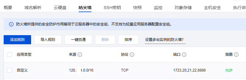 由于PPTP协议有漏洞 服务拒绝攻击(无需登录)CVE-2023-23404 所有在腾讯云的防火墙里自己设置策略。仅让自己所在运营商的IP段访问。
