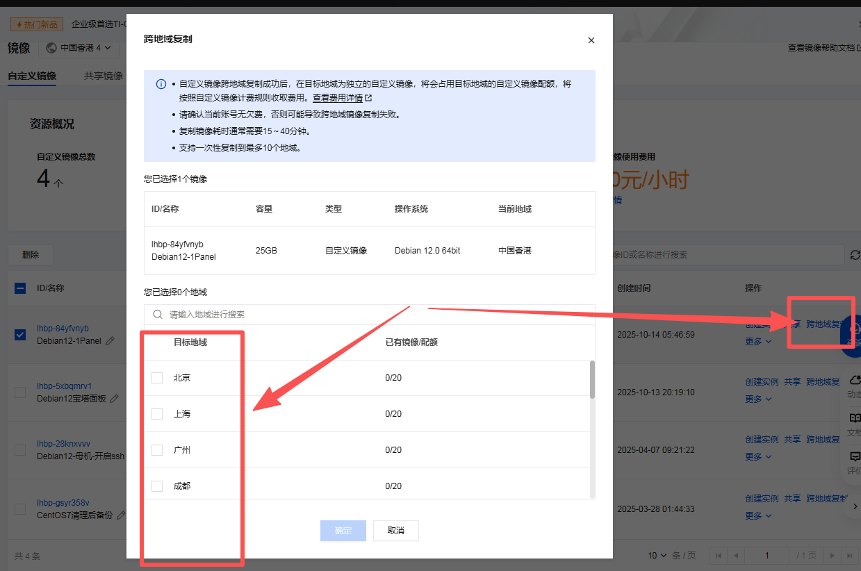 本人操作步骤是如下,大家可以借鉴下。 1.单步骤调试前做镜像,2个镜像名额足够完成单模块功能调试。 2.单模块功能调试完成,下一个模块调试前。制作镜像 3.本机镜像满5个后用,使用 跨地域复制 随便找个区复制过去。 (复制到其他区,之后删除本机镜像。) 4.重复步骤3.(17个区一个区5个名额 )=85个镜像 85个镜像 还要啥自行车。随便折腾