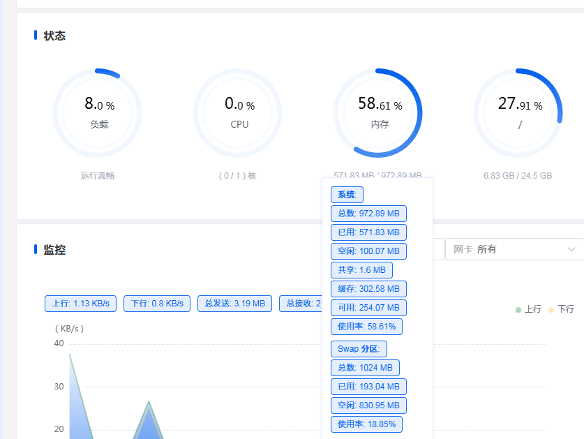 OpenResty、MariaDB10.11.14 、Redis 8.0.3 、PHP 8.46、 PHP 7.4.33 比宝塔多用100M(宝塔是调优过的) 1Panel后期使劲挤一挤 100M肯定是能空出来的。 两个面板同环境大致使用内存都一样。
