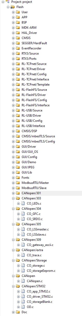 1、集成了CMSIS6.10,CMSIS-Driver,CMSIS-DSP,CMSIS-Viwer,CMSIS-Compiler,CMSIS-RTOS V2,CMSIS-FreeRTOS,CMSIS-RTX,CMSIS-MbedTLS等,全部采用的当前最新版。 2、网络协议栈,单网络协议栈同时管理DM9000和DM9162双网口。 3、文件系统,同时管理外挂U盘,NAND Flash和SD卡。 4、USB协议栈,RL-USB同时外挂USB FS和USB HS两个USB外设,USB FS接口用于外接电脑,实现SD卡和NAND模拟U盘,USB HS用于外挂U盘设备。 5、加密算法库使用的CMSIS-mbedTLS。 6、BSP外设驱动,部分是采用的CMSIS-Driver,其他都采用我们自己设计的。 7、Modbus RTU主从。 8、emWin6.46。 9、CANopen。