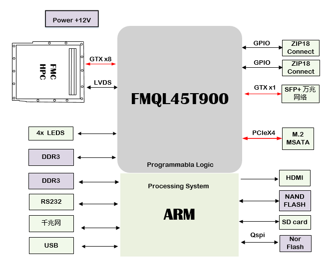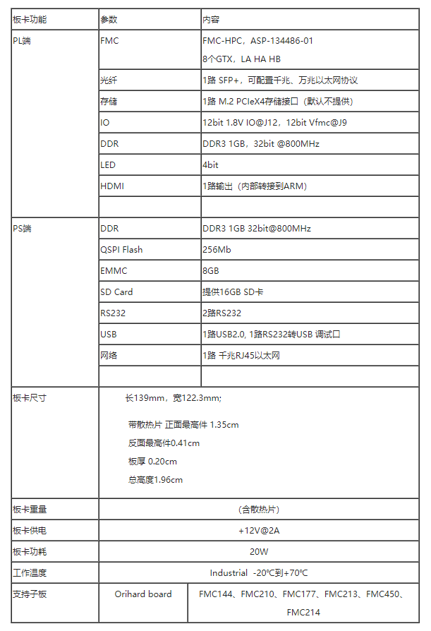 板卡由 FMQL45T900I芯片来完成卡主控及数字信号处理, FMQL45T900内部集成了两个ARM Cortex-A9核和一个kintex 7的FPGA,通过PL端FPGA扩展FMC、光纤、IO等接口,PS端ARM扩展网络、USB、RS232等接口。板卡适应于图像处理、震动、通信、雷达等前端信号处理或者手持机等开发。