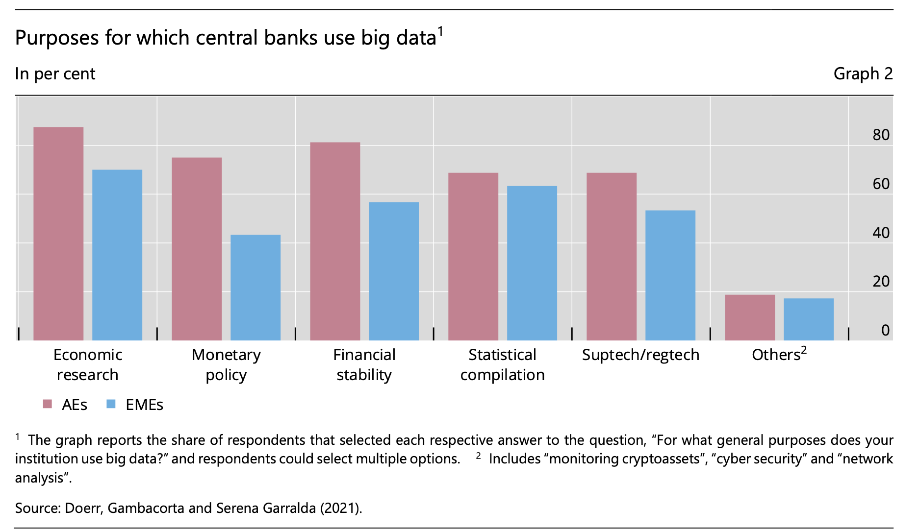 中央银行和监管机构已在四个核心职能领域广泛部署人工智能技术。早在生成式AI兴起之前,无论是发达经济体(AEs)还是新兴市场经济体(EMEs)的央行,都已在经济研究、货币政策、金融稳定和统计编制等领域应用大数据和人工智能。