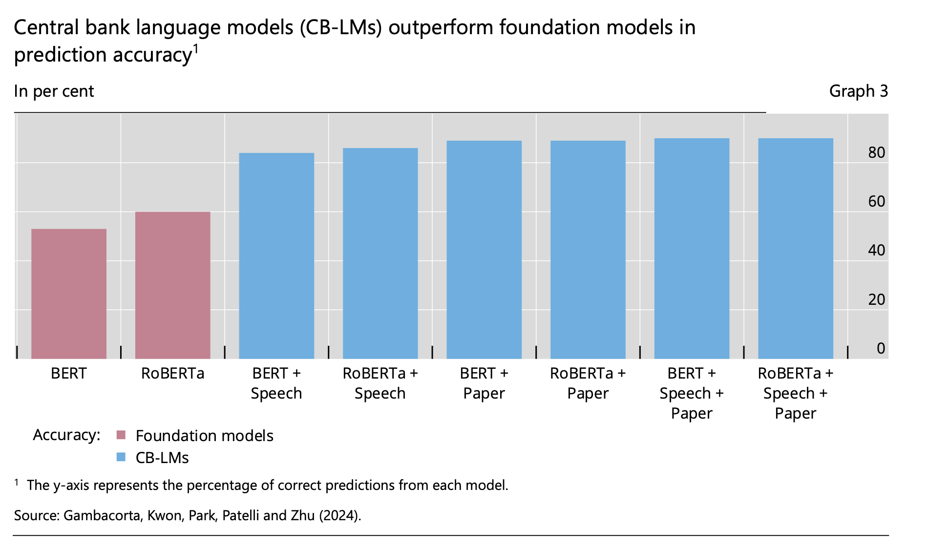 为了让人工智能模型更贴近政策制定的特殊需求,领域专属的大语言模型应运而生。国际清算银行(BIS)的央行语言模型(CB-LM)项目便是一个典型例子。该项目利用BIS中央银行中心的数千份演讲稿和研究论文,对开源的基础模型进行微调。经过这种领域知识的强化训练,模型在解析货币政策术语方面的准确率从50-60%大幅提升至约90%。它能够更精准地完成分类政策立场、预测市场对政策公告的反应等复杂任务。