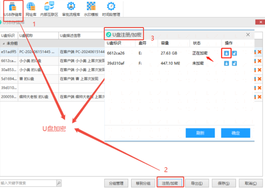 在软件后台中,管理员可通过【工具箱】进入【USB存储库】,点击【U盘注册/加密】按钮,系统将自动识别已连接的U盘。选择需加密的目标设备后,设置密码,即可启动加密流程。操作简便,确保U盘数据从源头得到保护,适用于企业对移动存储的规范化管理。
