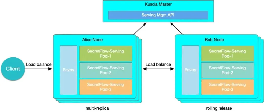 在确保在线推理系统的高可用性上,隐语通过 Serving + Kuscia 的组合,实现了在线服务治理、多副本、负载均衡以及故障转移等功能,提供生产级高可用解决方案,同时具备优秀的可观测性。