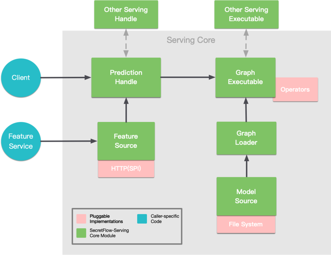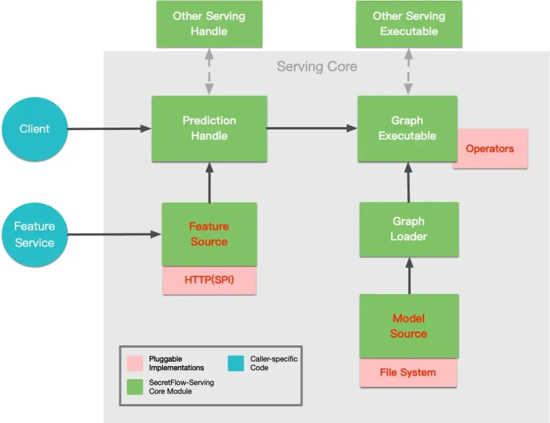 框架内部通过预测调度器和模型执行体与其他 Serving 系统进行调度与计算的通信,以支持不同技术路线的隐私计算模型推理。