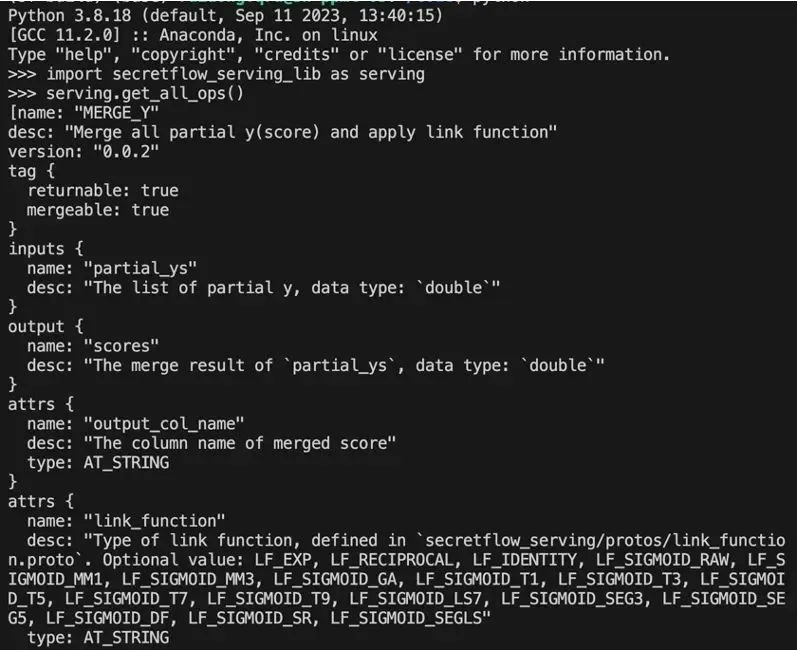 不使用 SecretFlow 的话,也可以通过 python 模块 secretflow-serving-lib 获取 SecretFlow-Serving 的 模型图定义与算子定义,可以此自行构建推理模型。