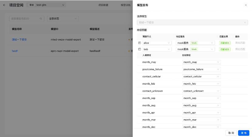 选择后即可实现离在线特征的映射。通常离线的特征和在线的特征命名方式不一样,平台可以提供一个快速匹配的方式去实现快速匹配。然后,点击确定,整个模型就发布好了。