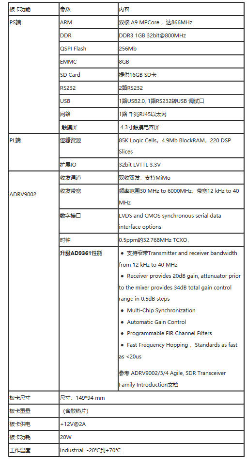 、板卡概述 板卡由ADI ADRV9002+Xilinx XC7Z020-CLG484芯片设计的整板,包含双路射频输入输出通道,支持千兆网络,RS232,触摸屏等接口,双核ARM支持Linux操作系统。板卡功耗很低,适合自定义的无线协议开发,如Loar、Wifi、4G平台等,也适合无线手持机、图传模块的产品开发。