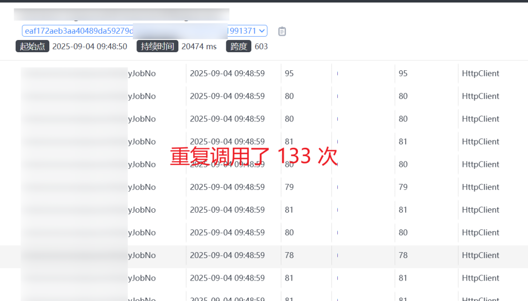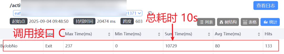 通过统计可以看到,在阶段 S1 中,系统总计 133 次重复调用了另外一个微服务的一个接口 C,平均一个耗时 80ms,总共耗费10s,如下图所示: