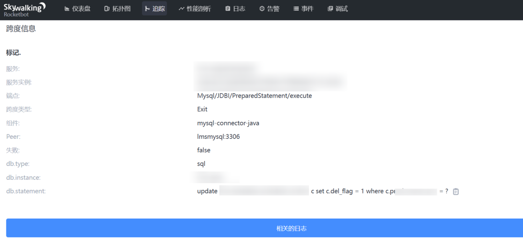 在阶段 S2 中,执行了一条比较耗时的 SQL 语句,我们可以从 Skywalking 上看到执行的 SQL 语句,如下图所示: