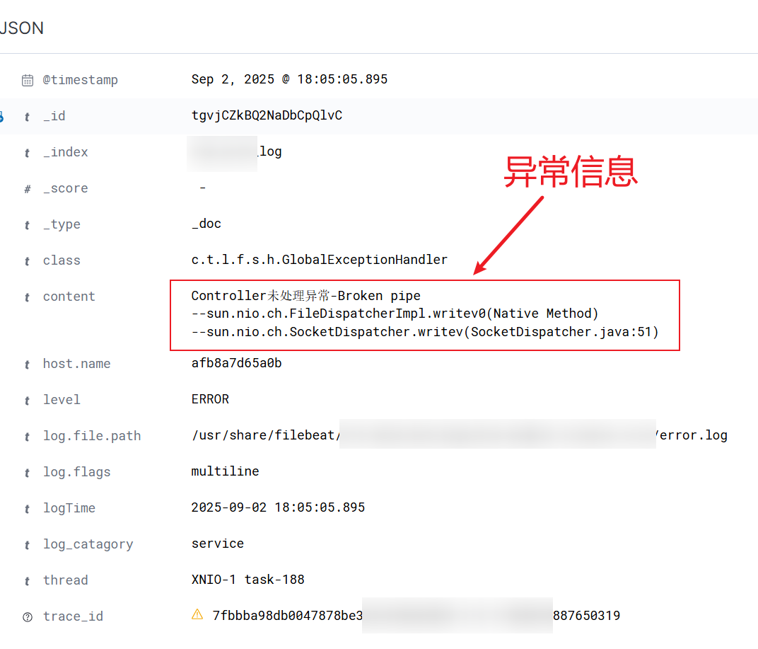 是不是有些日志没搜全呢?用 trace id 把整个链路的日志一起查出来看下,果然发现了一点端倪:系统在处理完请求后报了一个错,跟业务代码无关,看起来是一个网络问题。报错信息如下: