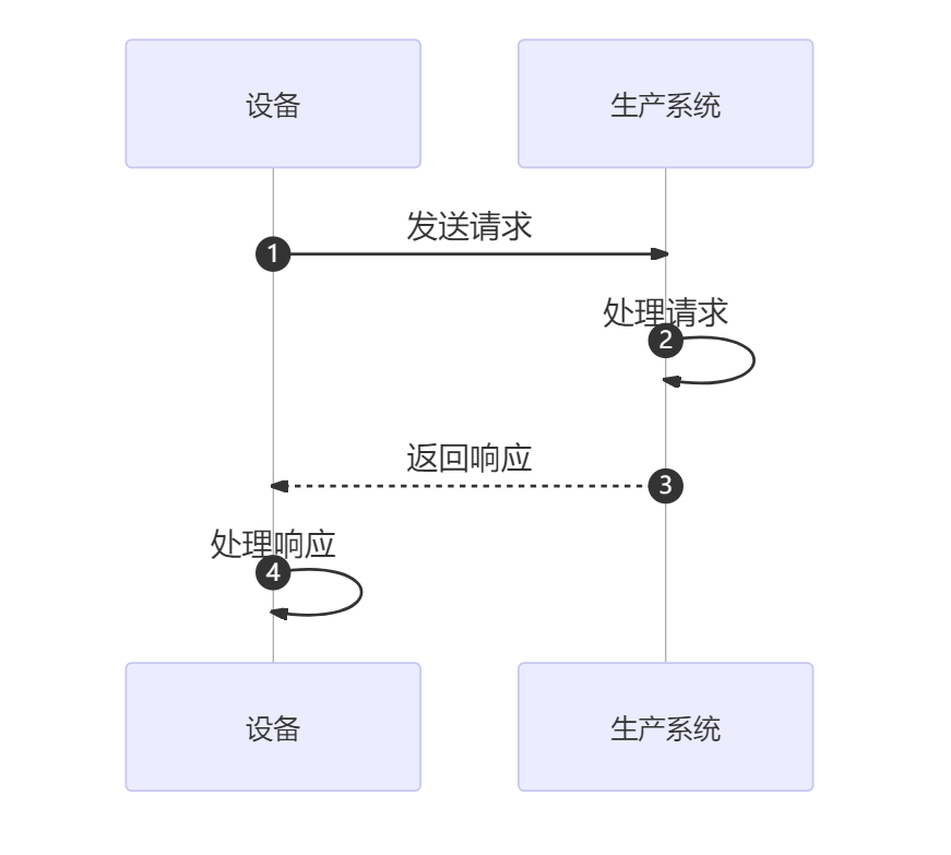 在一个风和日丽的下午,我正在享受着敲代码带来的的心流体验,突然生产那边的同事告诉我有一台设备无法正产生产,这种情况偶尔也会遇到,一般都能很快解决,但这次不同。下面是设备和生产系统简化后的交互示例图。